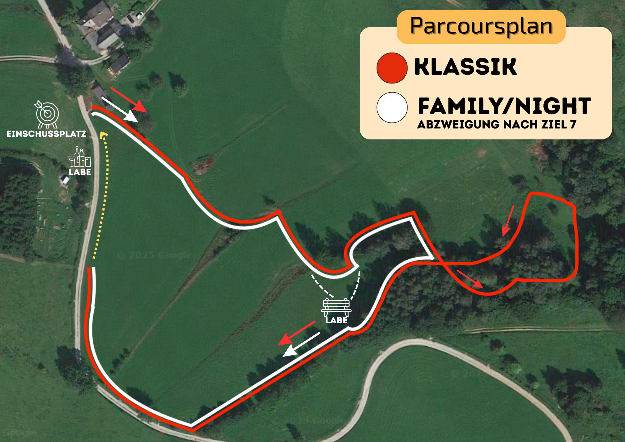 Dieser Parcours ist eine Kombination aus Klassik- und Winterparcours – also vorbereitet auf alles: sonnig, verschneit oder rutschig. Der Einstieg befindet sich beim Weg hinauf zum Einschussplatz. Folgt den ausgeschilderten Pfeilen, passt auf Schnee, Eis und Wurzeln auf. ❄️🌲